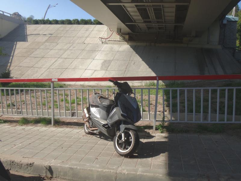 Уже около полугода на Пионерской под путепроводом ДКП стоит брошенный скутер STELS, привязанный тросом к перилам. Возможно, угнанный. В модельном ряду данного производителя не разбираюсь, на переднем обтекателе написано "Racing sport".